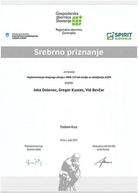 V okviru letošnjega razpisa za najboljše inovacije Gorenjske je podjetje ENEKOM prejelo srebrno priznanje za inovacijo »Implementacija strojnega učenja v ENIS 3.0 kot orodje za izboljšanje AcEM«.